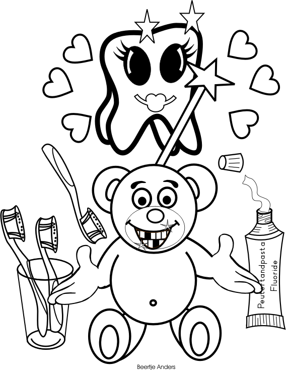 'Goedemorgen, beertjes' zegt Beer Juf. 'Goedemorgen Beer Juf', 'Goedemorgen Beer Juf', 'Goedemorgen Beer Juf', 'Goedemorgen Beer Juf', zeggen de beertjes in koor. Vandaag komt Beer Zorg jullie les geven, over 'zorg goed voor jezelf'. 'Goedemorgen beertje', zegt Beer Zorg. 'Goedemorgen Beer Zorg', 'Goedemorgen Beer Zorg', 'Goedemorgen Beer Zorg', 'Goedemorgen Beer Zorg', zeggen de beertjes in koor. Ik ben blij dat jullie er allemaal zijn. Er is niemand ziek. Misschien komt dat wel door mijn vorige les. En vandaag gaan we het over iets heel anders hebben, namelijk; jullie tanden. Beren moeten hun tanden goed verzorgen. En dat betekend twee keer per dag poetsen, vooral als je al grote berentanden hebt. Wie van jullie heeft er al grote berentanden? 'Ik', 'Ik', 'Ik', 'Ik', 'Ik', roepen alle beertjes. Laat jullie tanden dan eens zien? Oo, ik zie het al. Jullie zijn jullie tanden aan het wisselen. Dan is er bij jullie vast al een tandenfee geweest. 'Ja, bij mij', 'Ja en bij mij', 'Ja bij mij', 'en bij mij' en ' o, o, ook bij mij', zeggen een paar beertjes. De tandenfee neemt je melktand mee. ze geeft je een kleine beloning en zegt dan: 'Zorg goed voor deze nieuwe tand, want hij moet nog je hele berenleven mee!' 'Ik heb nog nooit zo'n fee gezien', zegt Beertje Bruin. Mijn moeder zegt wel hetzelfde en heeft een euro onder mijn kussen neergelegd, maar die fee ken ik niet. 'Dan is je moeder de tandenfee', zegt Beer Zorg. 'Het belangrijkste is de boodschap, je moet goed voor je tanden zorgen' 'Ik zei het al in het begin: Zorg goed voor je tanden, dus twee keer per dag poetsen. 's morgens na het ontbijt en 's avonds voor het slapen gaan. Poetsen kun je het beste doen met goede tandpasta met fluoride. Spoel je mondje niet te vaak, een keer is voldoende. Tijdens het spoelen gaat anders veel flouride weg. Gebruik de juiste tandenborstel. Tandpasta op de borstel en dan poetsen maar. Er zijn een paar dingen waar je goed op moet letten, namelijk een vaste volgorde voor het tandenpoetsen, dan worden geen tandjes over geslagen. Eerst de binnenkant, dan de buitenkant. De tandenborstel half op de tanden en half tegen het tandvleesrandje aanzetten. Poets de puntjes van nieuwe tanden die doorbreken ook gelijk mee. Poets tenminste twee minuten je tanden. Je kunt dit het beste doen met een klok of een zandloper. Poets de tanden voor een spiegel, zodat je goed ziet wat je doet. Het tandenpoesten kun je het beste even laten controleren door Vader of Moeder Beer. Zij kunnen het beste ook nog even na poetsen. De meeste beertjes gaan twee keer per jaar naar de tandarts voor controle. De tandarts kijkt of het goed gaat met je tanden en of er geen gaatjes zijn. En ik herhaal nog één keer de belangrijkste punten.