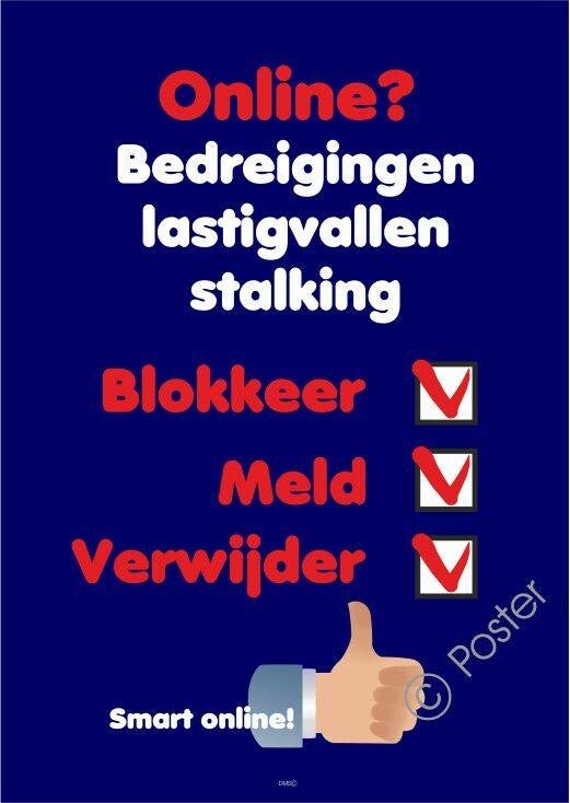 Weet wat je kunt doen: blokkeer, meld en verwijder de berichten. Deze poster biedt jongeren duidelijke handvatten om om te gaan met online bedreigingen en stalking. Door zichtbaar op te hangen in school of jeugdruimtes draagt de poster bij aan bewustwording én een gevoel van veiligheid. Onderdeel van de serie ‘Smart online!’ – negen posters over veilig, respectvol en verantwoordelijk internetgebruik.