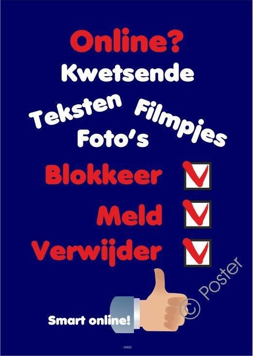 Deze poster maakt jongeren bewust van de gevaren van online pesten, kwetsend gedrag en het ongevraagd verspreiden van content. Een visuele reminder dat je niet alles hoeft te accepteren wat online gebeurt – en dat je altijd stappen kunt nemen om jezelf te beschermen. Onderdeel van de serie ‘Smart online!’, bestaande uit negen posters over veilig, respectvol en verantwoordelijk internetgebruik.