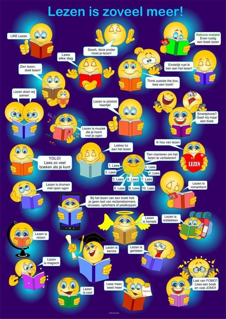 Deze kleurrijke en vrolijke A1-poster laat zien dat lezen écht meer is dan alleen woorden op papier. Met grappige emoticons en korte, herkenbare teksten trekt de poster direct de aandacht van leerlingen, kinderen én volwassenen.