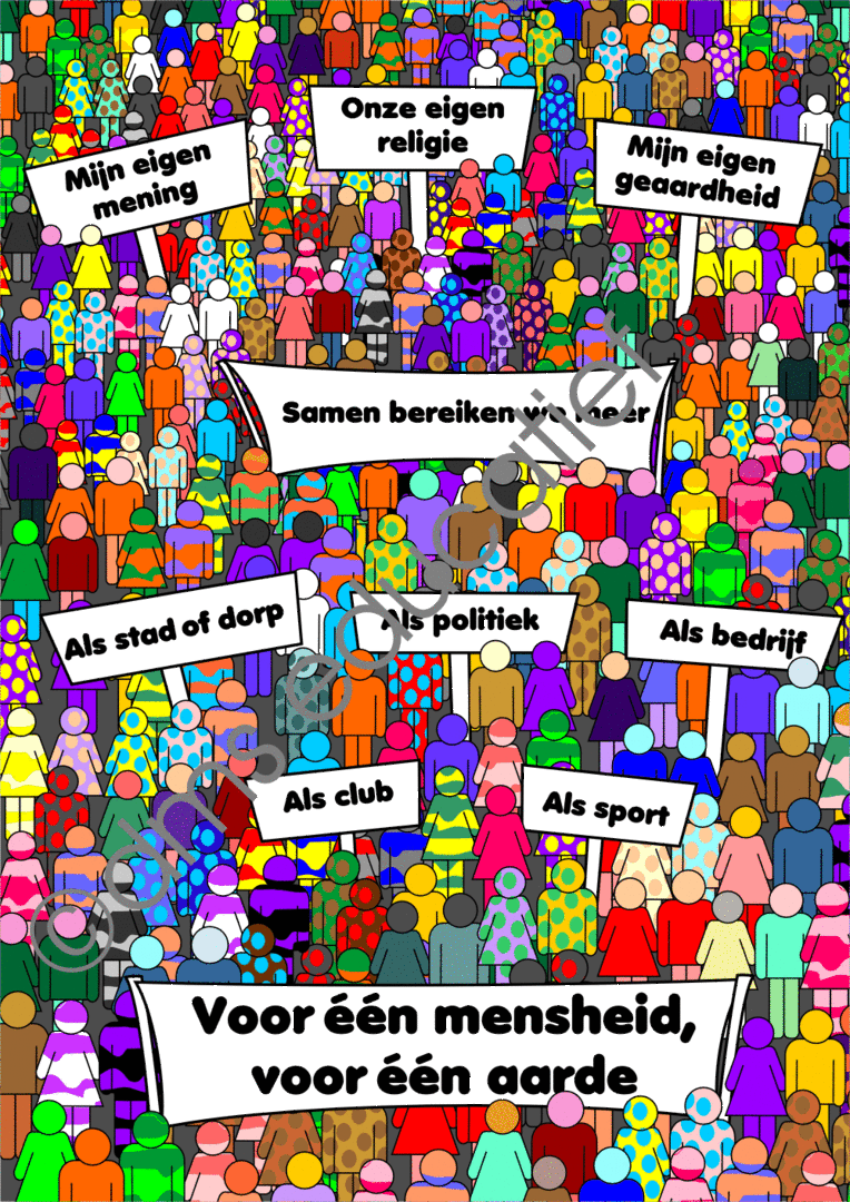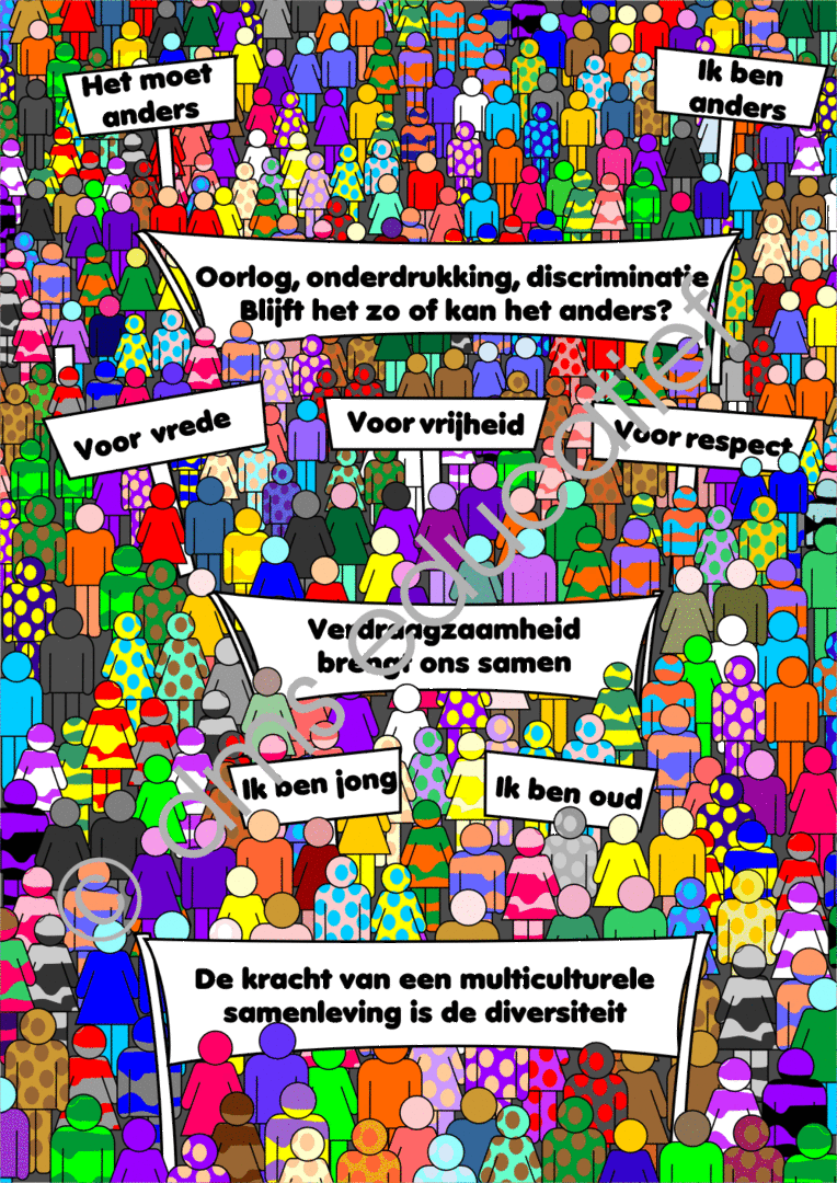 De posterset „Multiculturele samenleving“ is een krachtig visueel statement voor gelijkheid, inclusie en wederzijds respect. De set bestaat uit drie kleurrijke posters die samen een drieluik vormen: in het midden een grote poster, geflankeerd door twee kleinere posters. Deze compositie benadrukt de kracht van diversiteit en nodigt uit tot dialoog en bewustwording.