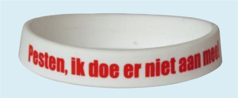 Wit armbandje met rode opdruk: 'Pesten, ik doe er niet aan mee'. Het armbandje is geschikt voor jongeren vanaf ongeveer 14 jaar en volwassenen.