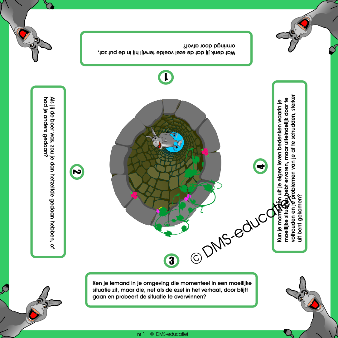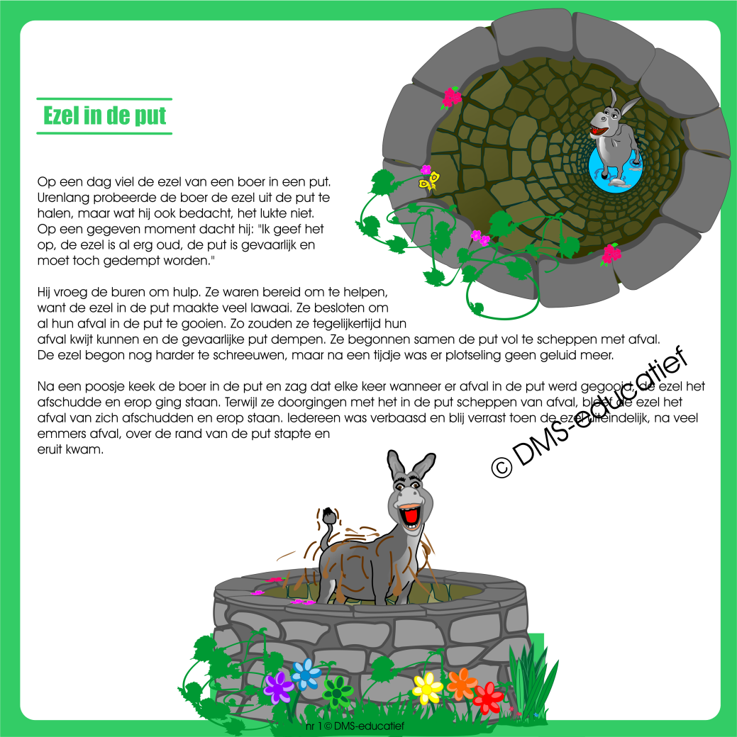 Een boer zijn ezel valt in een put, en ondanks urenlang proberen, lukt het de boer niet om het dier eruit te krijgen. De boer besluit de put te dempen door afval erin te gooien. Terwijl de ezel het afval afschudt en erop gaat staan, komt hij uiteindelijk, na veel afval, uit de put. Het verhaal en de vragen zetten de leerlingen aan het denken en praten over doorzettingsvermogen, omgaan met tegenslag, en zelfredzaamheid.
