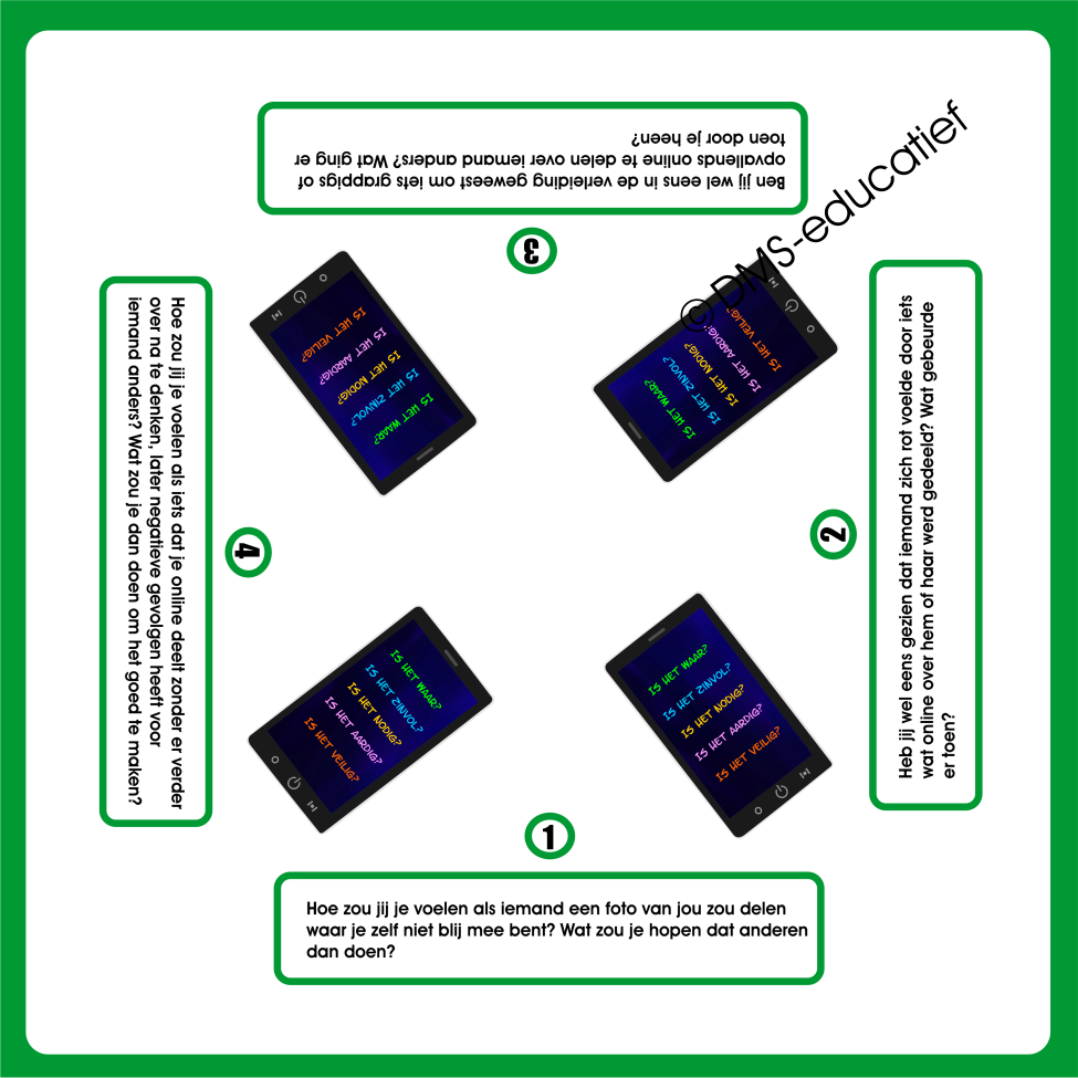 Deze vraag helpt leerlingen om zich te verplaatsen in de ander. Het doel is om empathisch bewustzijn te vergroten: wat voor de één grappig is, kan voor de ander kwetsend zijn. Door na te denken over hoe het voelt als je zélf onderwerp bent van een ongewenste post of grap, worden leerlingen zich bewuster van de impact van hun online gedrag. Dit vormt een belangrijke stap richting respectvoller handelen in groepsapps en op sociale media.