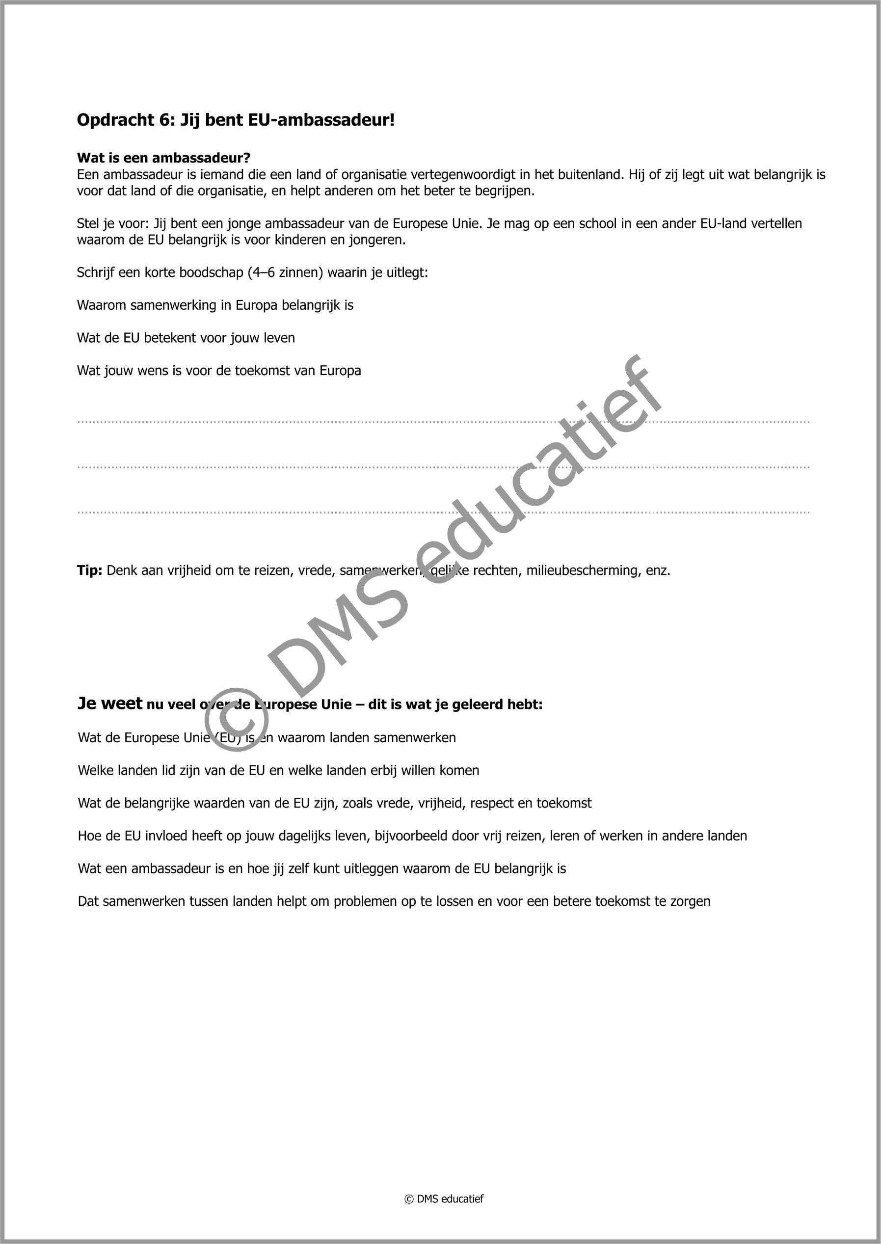 De opdrachten – zoals landen en vlaggen verbinden, kernwaarden koppelen en quizvragen beantwoorden – sluiten perfect aan bij de poster. Zo leren leerlingen spelenderwijs over de 27 EU-landen, 10 kandidatenlanden en waarden als vrede, vrijheid, respect en toekomst.