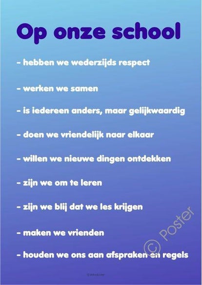 Een overzichtelijke en positieve poster met heldere schoolafspraken. Deze poster helpt om structuur, duidelijkheid en een veilige sfeer te creëren in de klas of op de hele school. Door de afspraken zichtbaar op te hangen, weten leerlingen wat er van hen verwacht wordt en wordt positief gedrag gestimuleerd. Perfect voor in de klas, hal, personeelskamer of centrale ruimte.