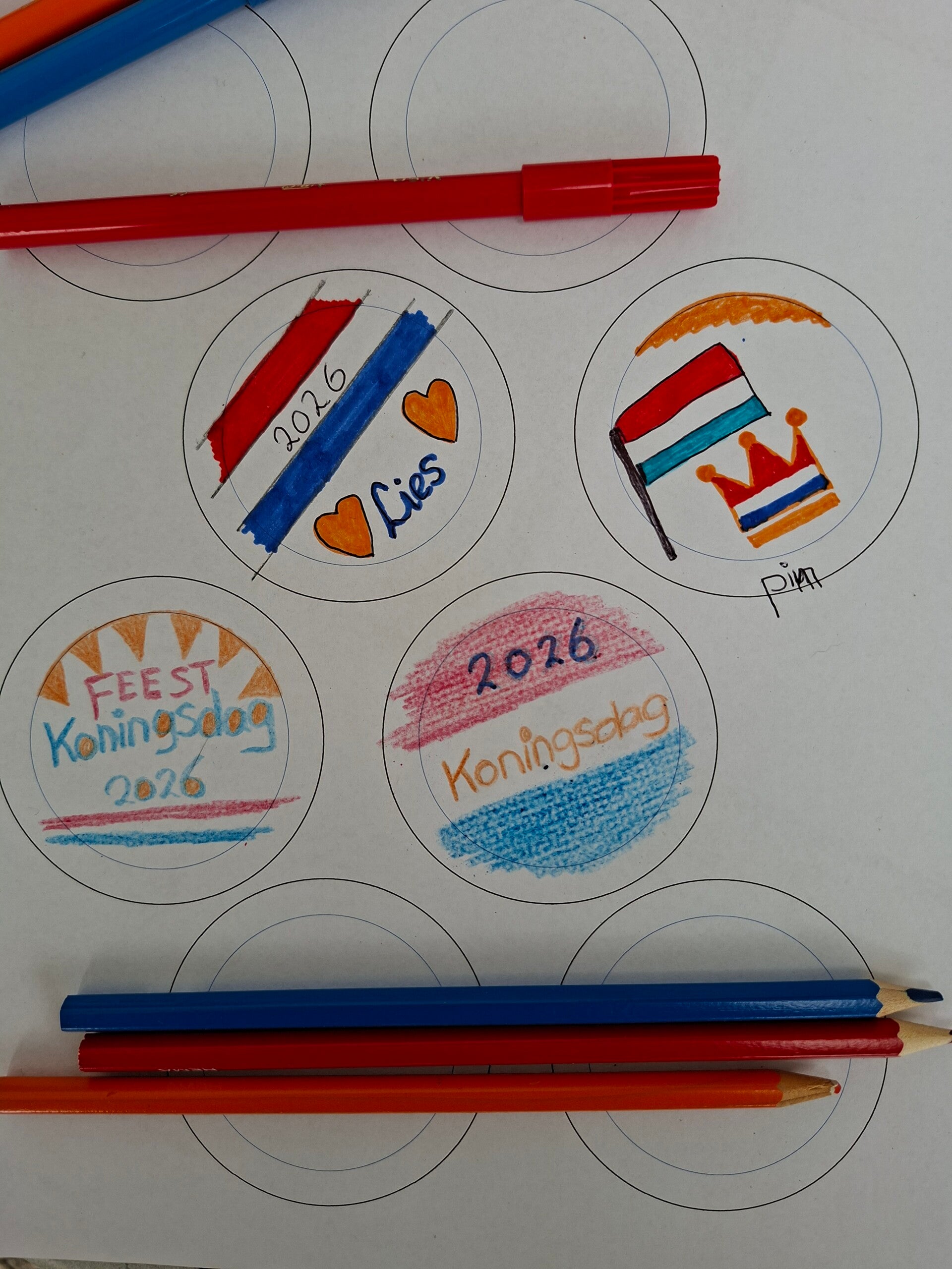 Combineer het ontwerpen van eigen buttons met feestelijke materialen voor een zichtbare en vrolijke Koningsdag op school.