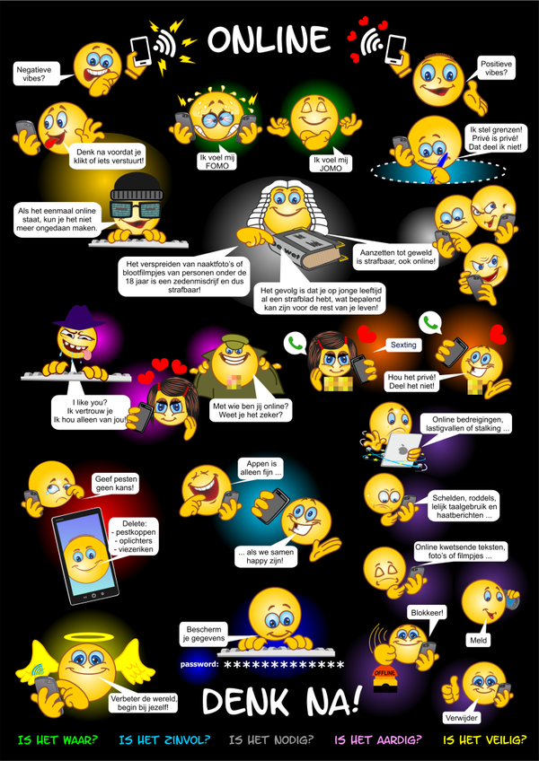 Een posterpakket met alle positieve en negatieve vibes die je online kunnen overkomen. Want ja, internet heeft heel veel leuke kanten en geeft je veel positieve gevoelens en ervaringen, maar aan het gebruik ervan kleven ook negatieve ervaringen en gevoelens. De posters maken leerlingen bewuster van hun internet gebruik. De korte, maar krachtige teksten zullen allemaal gelezen worden en maken de thema's gemakkelijker bespreekbaar.