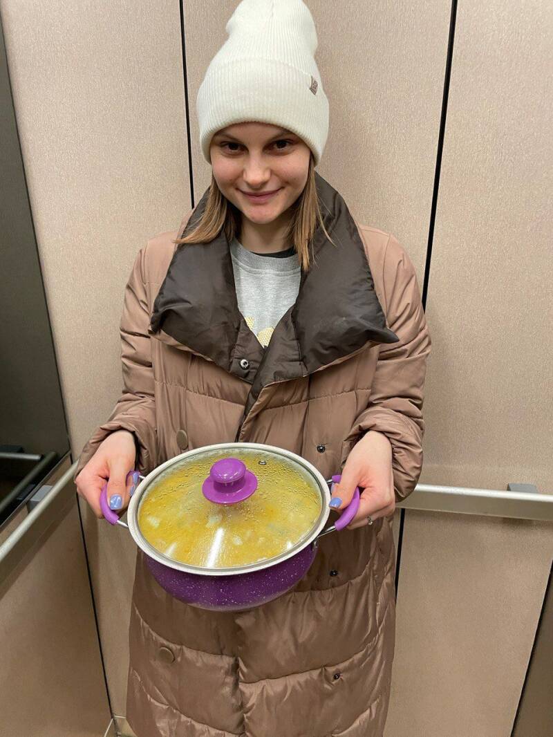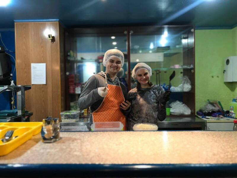 Toen Veronika nog in Oekraïne was heeft zij samen met Nikita en andere vrijwilligers eten klaargemaakt voor 80 mensen die in lege gebouwen hun toevlucht gezocht hadden omdat hun eigen huis te zwaar beschadigd was om in te wonen. Met twee slow cookers gingen ze elke dag een maaltijd koken, nadat ze hiervoor de nodige boodschappen gedaan hadden.